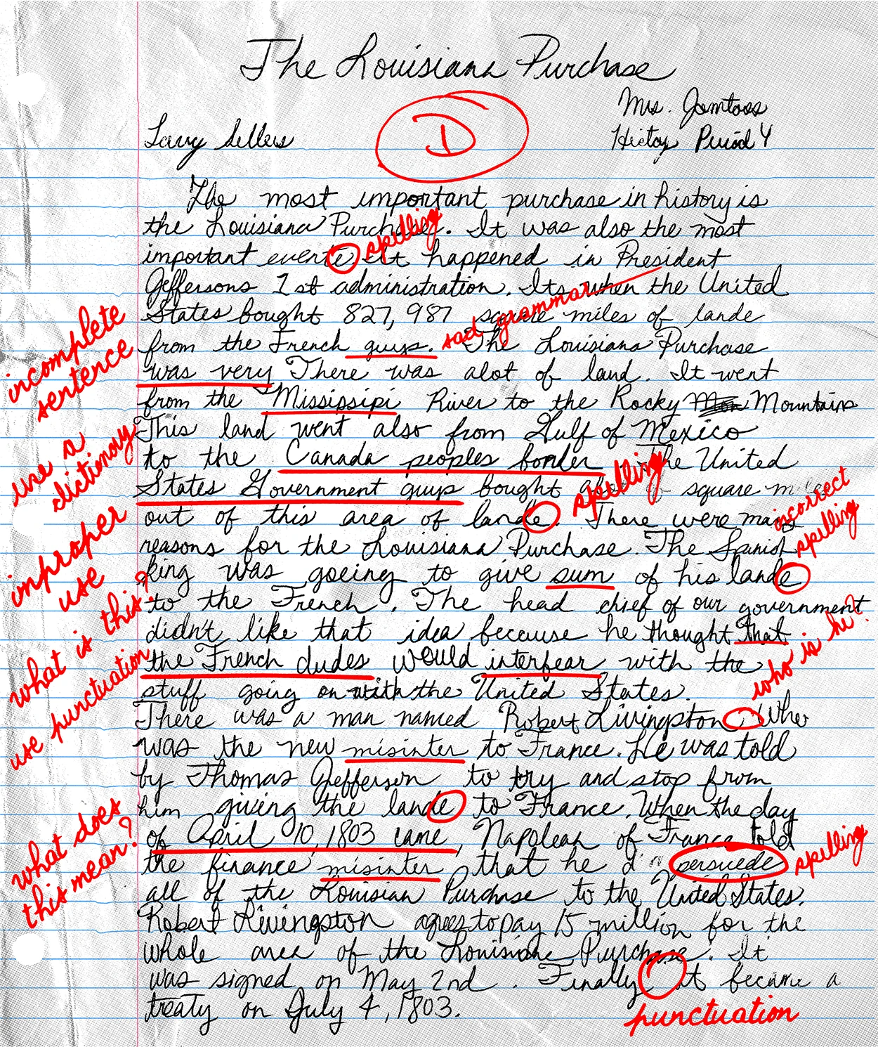 Larry is flunking Social Studies. There are notes from the teacher in red marker like : Spelling? and Use a dictionary! The subject of the paper is the Louisiana Puchase.